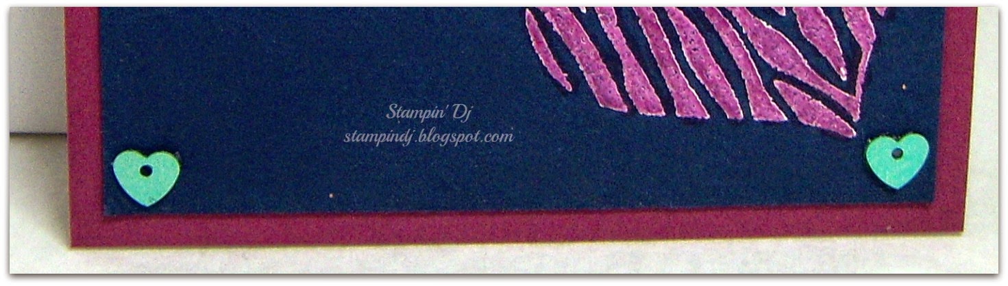 The second card I made features my favorite image from the Groovy Love set; the zebra stripes. I embossed the Hearts and "Groovy Kind of Love" in White on Night of Navy Cardstock. Then I used the Rich Razzleberry and Coastal Cabana Blendabilities to color on top of the embossing. I mounted this 3" x 3" layer on a piece of 3-1/4" x 3-1/4" Rich Razzleberry Cardstock. I added four of the Coastal Cabana Heart Sequins from the 2013-2015 In Color Sequins.